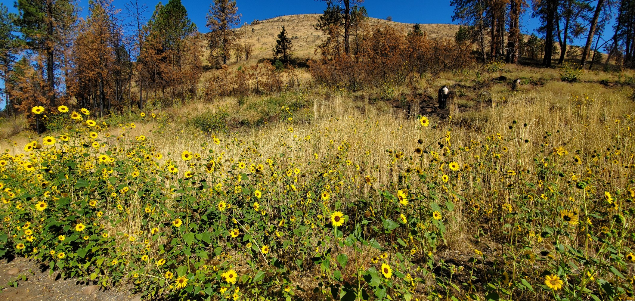 Burned trees and sunflowers
