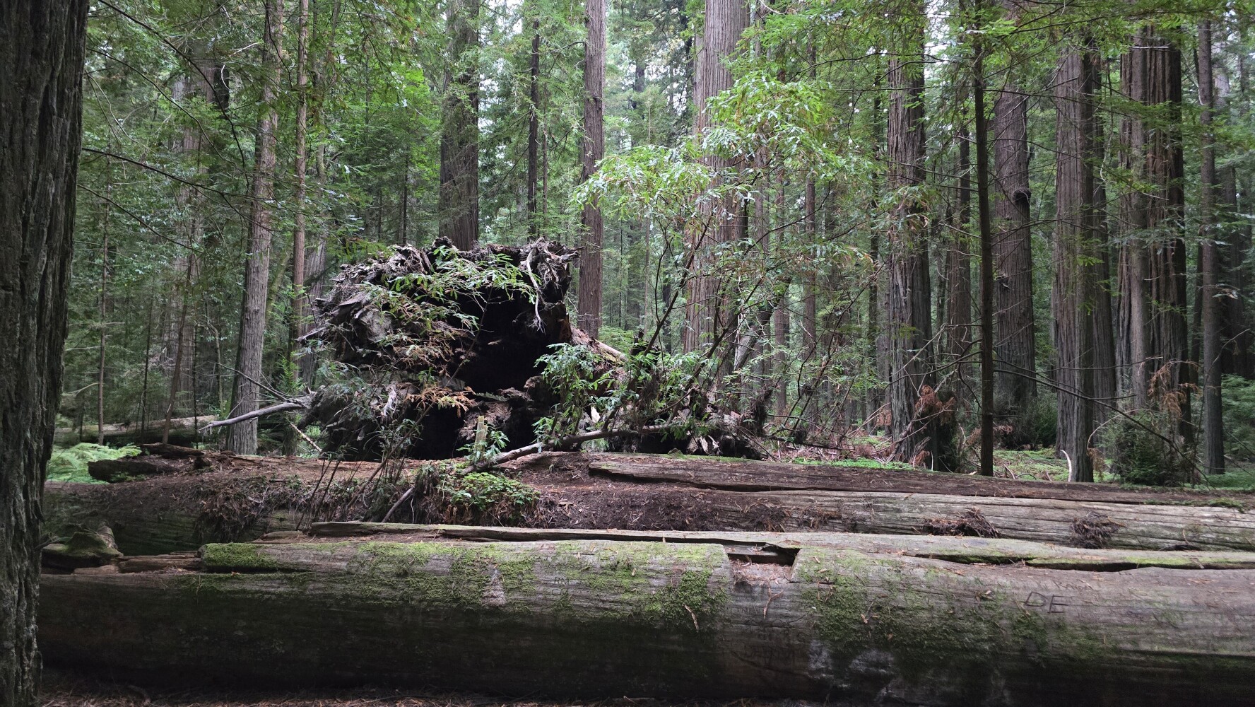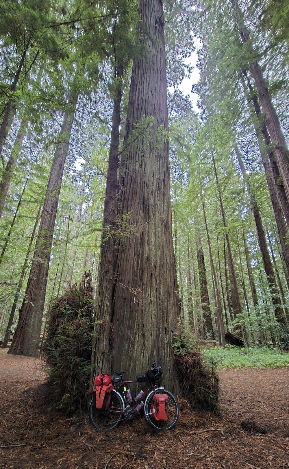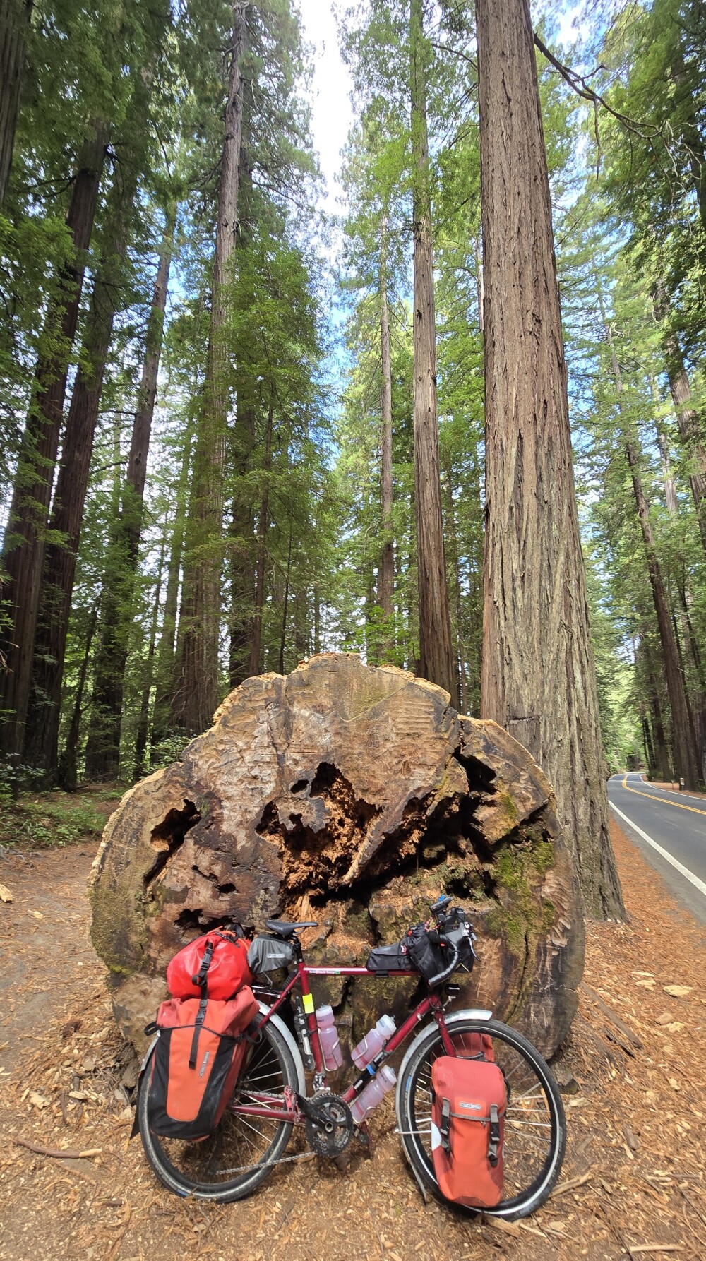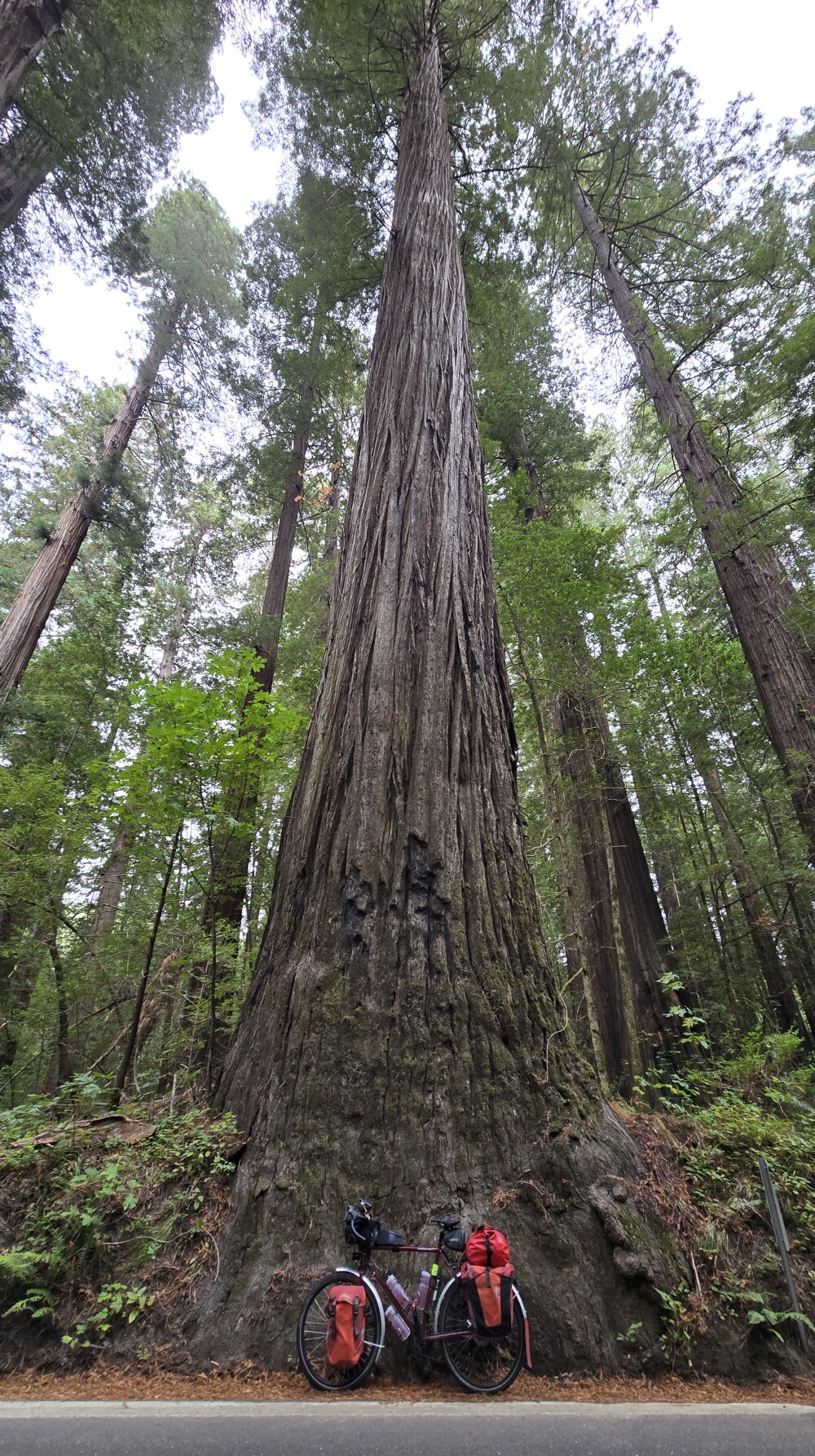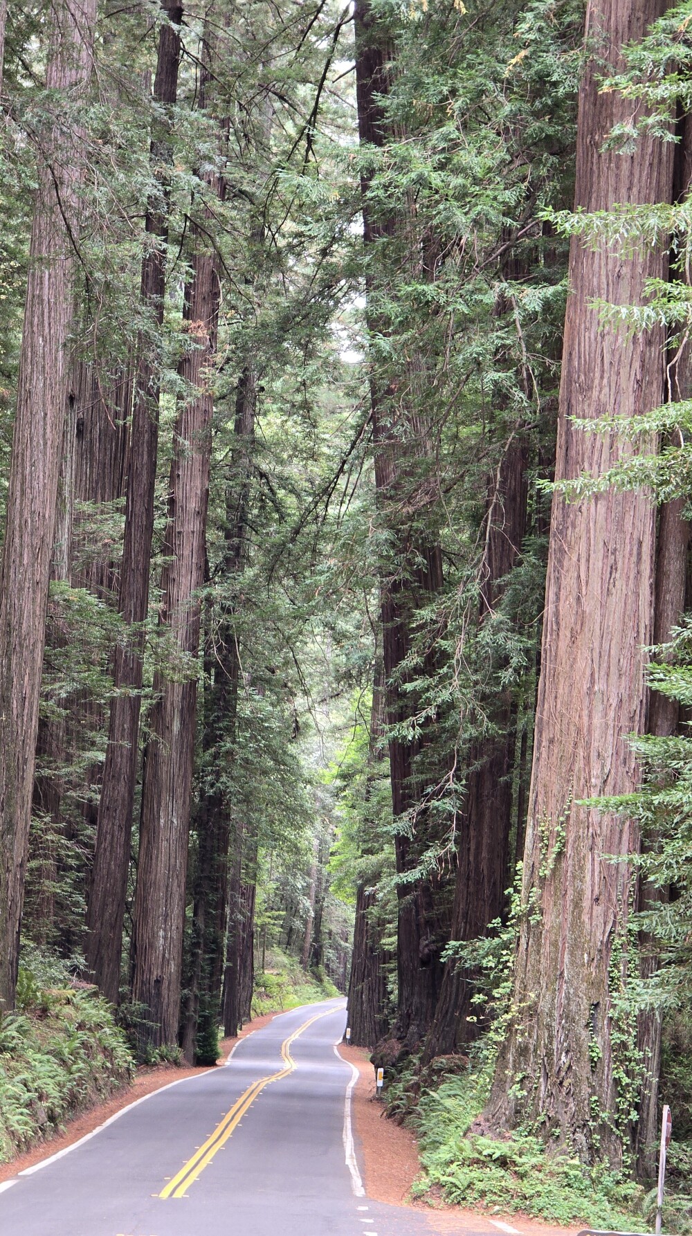 They passed me, and I figured I wouldn’t see them again, but the Avenue of the Giants road was closed ahead, and they turned around and let me know there was a Caltrans person enforcing it. I’ve been able to plead for special permission before (“My bike is heavy! I’ll get lost!” And so on…), so I kept going, but it really WAS closed. A tree was down over the road. I guess redwoods fall down too! I tried to get permission to ride up to it just to get a picture, promising to come back, but he was firm. He had a picture of the tree, but he wouldn’t send it to me (probably doesn’t want to share his email address?), but he let me take a picture of his picture. 😁