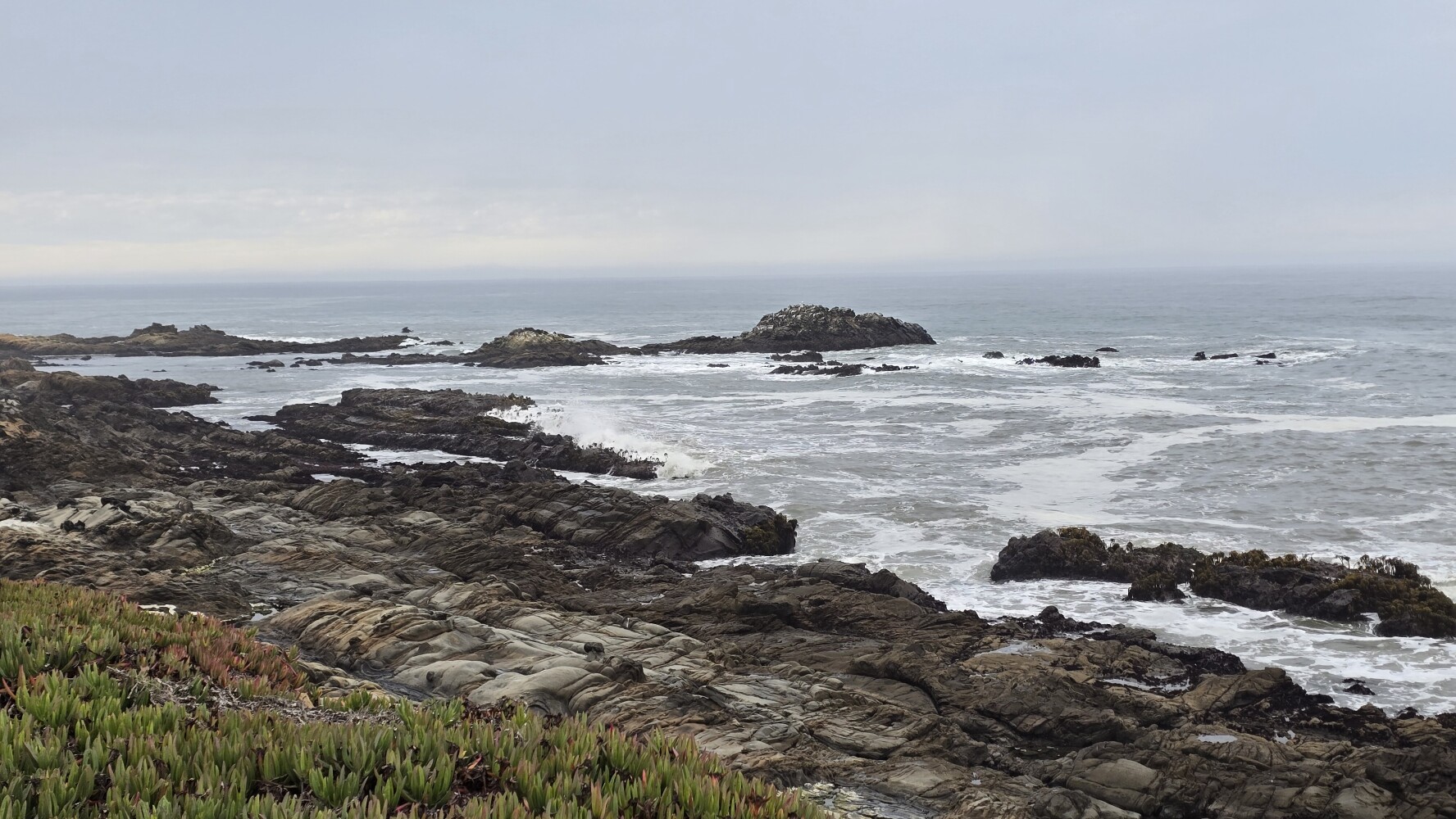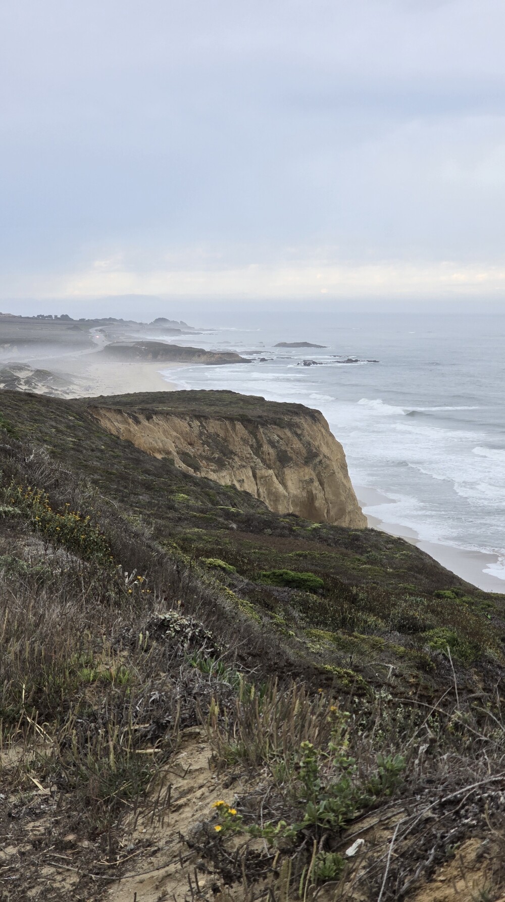 I saw a guy taking pictures at a little parking area on the highway, and stopped to ask what he was seeing. There were at least a half-dozen dolphins in the water, swimming very slowly up and down the beach, arcing out of the water every once in a while (I couldn’t get a picture of this!). The man I was talking to was a local surfer, and he told me that great white sharks are frequently seen there, and that something was discovered BITTEN just yesterday! I couldn’t tell what that something was over the sound of the waves. I told him not to get eaten, and have fun, in the same spirit that people tell me not to get run over on narrow highways – as if it was fully in my control! 😁