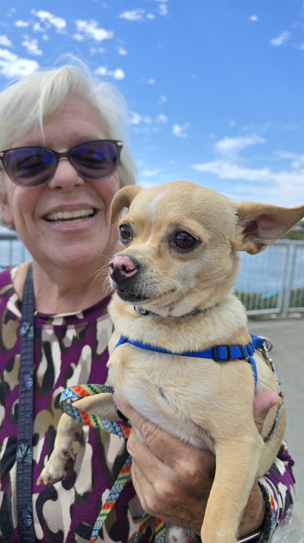 This is Indy.  He loves people, is a little wary about cellphones in his face, and absolutely hates other dogs, especially the ones that can easily eat him.  That is why he is being held in this picture. 😁
